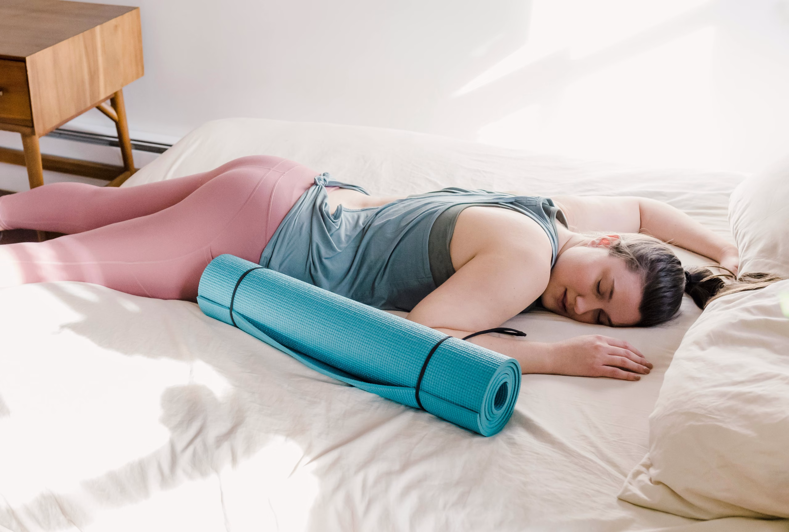 Image description for this section: A cozy setup with essential oils, a yoga mat, and a comfortable bed.